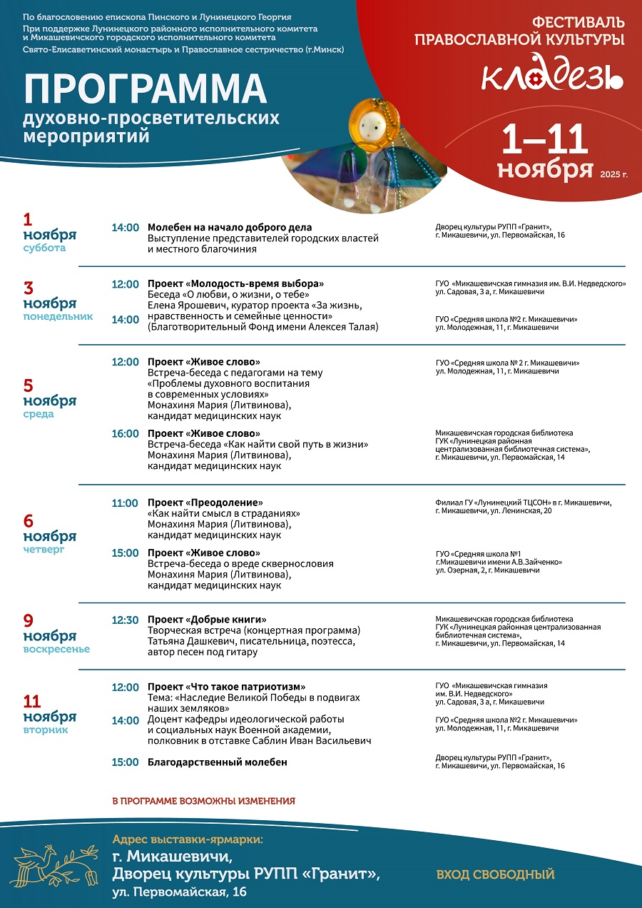 По благословению епископа Пинского и Лунинецкого Георгия и при поддержке местных исполнительных комитетов с 1 по 11 ноября 2025 года фестиваль православной культуры «Кладезь» с выставкой-ярмаркой пройдет в Микашевичах.