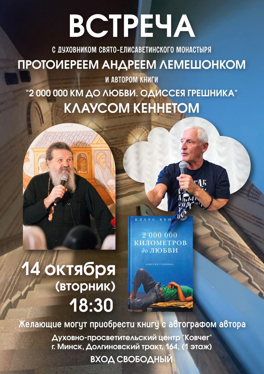 Дорогие друзья! Во вторник, 14 октября, на беседе духовника обители протоиерея Андрея Лемешонка с прихожанами выступит гость нашей обители — автор книги «2 000 000 километров до Любви. Одиссея грешника» Клаус Кеннет.
