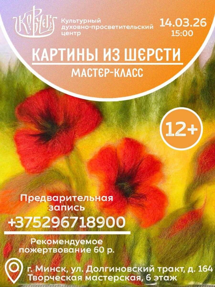 Дорогие друзья! В субботу, 14 марта, приглашаем вас на мастер-класс, где вы научитесь создавать изображения с помощью шерсти (все необходимые материалы будут предоставлены).