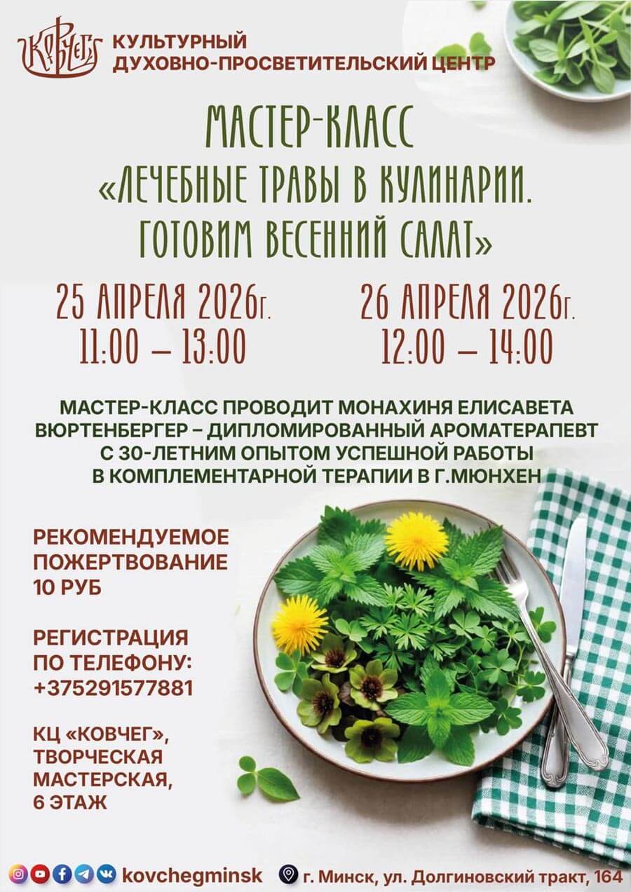 Друзья! Приглашаем вас на мастер-класс «Лечебные травы в кулинарии. Готовим весенний салат». Его проведет монахиня Елисавета (Вюртенбергер), специалист из Германии с 30-летним опытом работы в комплементарной терапии.