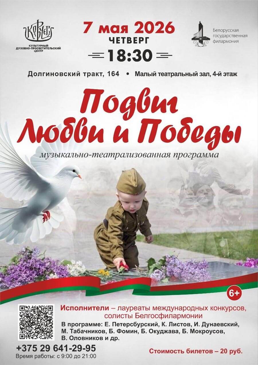 Дорогие братья и сестры! В канун Дня Великой Победы, 7 мая (четверг), духовно-просветительский центр «Ковчег» и Белгосфилармония приглашают вас на музыкально-театрализованный концерт «Подвиг Любви и Победы».