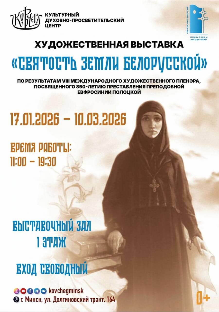Дорогие друзья! Приглашаем вас на художественную выставку «Святость земли Белорусской» по результатам VIII Международного художественного пленэра, посвященного 850-летию преставления преподобной Евфросинии Полоцкой. Торжественное открытие — 17 января в 12:00.