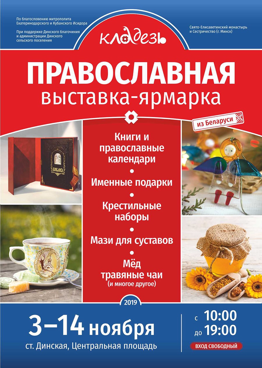 С 3 по 14 ноября в станице Динская пройдет православная выставка-ярмарка «Кладезь». Мероприятие состоится в рамках программы «Единая вера — единая Русь Святая» по благословению Митрополита Екатеринодарского и Кубанского Исидора при поддержке Динского благочиния и администрации Динского сельского поселения. Организатор программы — Свято-Елисаветинский монастырь и Сестричество во имя преподобномученицы Великой княгини Елисаветы (г. Минск).