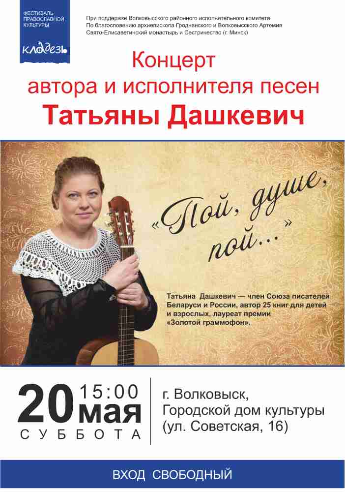 20 мая в 15:00 в Городском доме культуры (ул. Советская, 16) пройдет концерт «Пой, душе, пой…» автора и исполнителя песен, лауреата премии «Золотой граммофон» Татьяны Дашкевич.