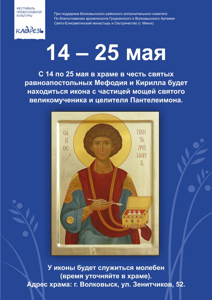 С 14 по 25 мая в храме в честь святых равноапостольных Мефодия и Кирилла (ул. Зенитчиков, 52) будет находиться икона святого великомученика и целителя Пантелеимона с частицей мощей.